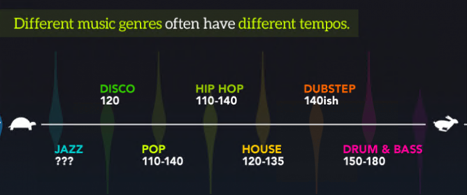 The setTempo() function allows you to set the overall project tempo. Tempo is the speed at which a piece of music is played. Changing a project’s tempo allows for different styles of music to be created. Try changing the tempo of your setTempo function by changing the number in the block and see what happens! Please make sure it is a number between 45-220. Below are some suggestions for tempos you can use.
