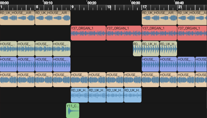 The Digital Audio Workstation (DAW) is the area which the sounds appear in. It is at the center top of your EarSketch window. The following is an example of how different sections of a song may look in the DAW.
