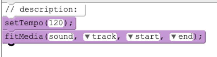sound- Navigate to the “Sounds” pane and find a sound you like. Click on “sound” in thefitMedia()function block, then press the “Paste” button beside the sound you wish to add. The name of the sound should now appear inside of thefitMedia()block.trackNumber- Use the dropdown to select any positive integer as the track number. For this example, select1.start/end- These parameters are positive integers quantified in measures. A measure is a segment of time which correlates to a specific number of beats. Try settingstartto1andendto9.